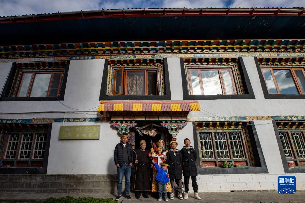 工布新年的大年初一,次仁頓珠(左一)和拉巴卓瑪(左三)一家在自家房前拍攝全家福(11月14日攝)。