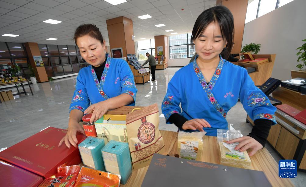 11月14日,在施秉縣産業園區一家電商企業的展廳,直播平台的工作人員在整理農産品。
