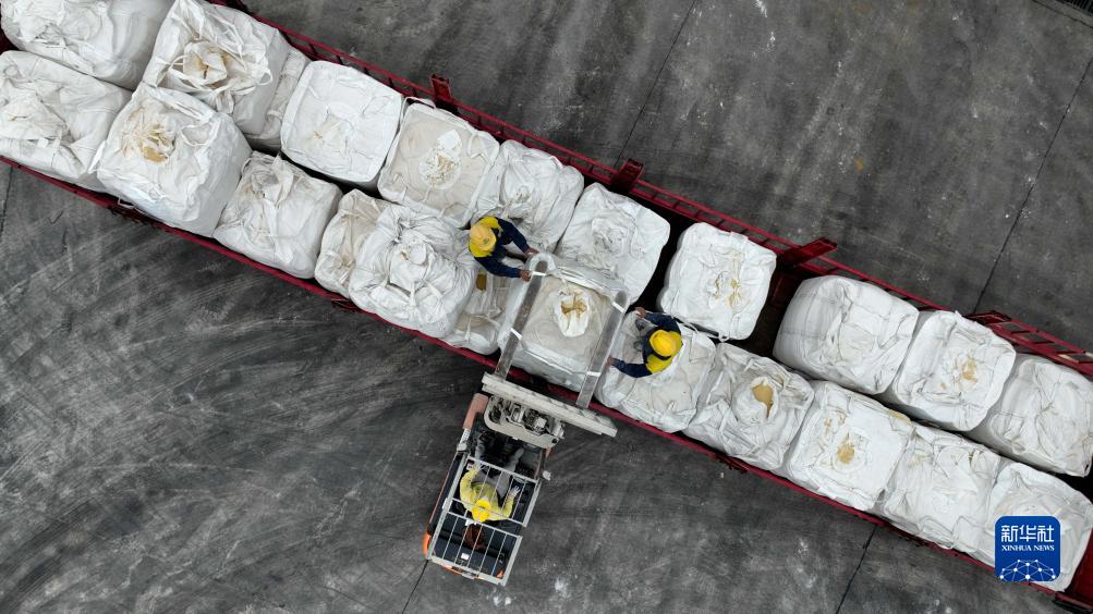 11月14日,工人在施秉縣一家飼料生産企業內搬運飼料(無人機照片)。