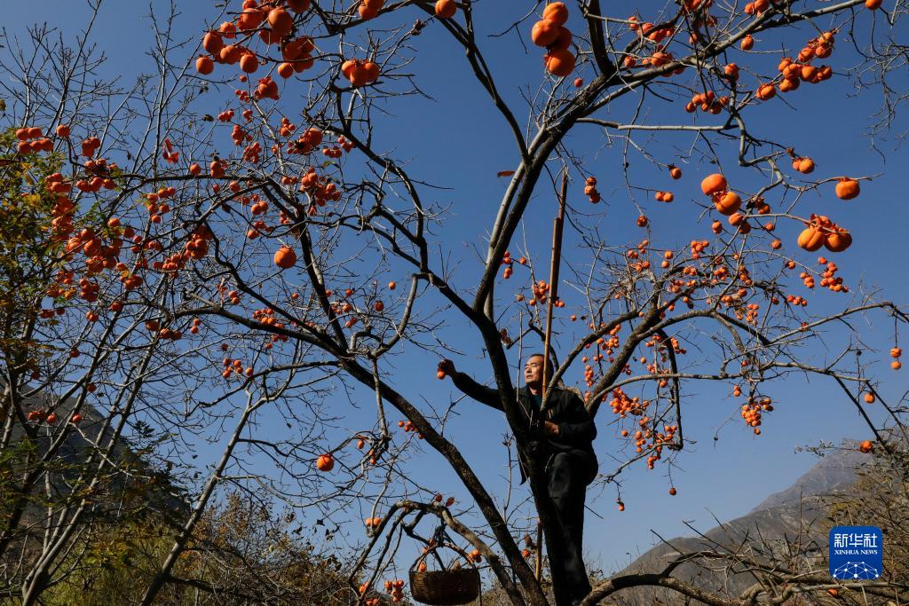 11月14日,在甘肅省甘南藏族自治州舟曲縣立節鎮傑迪村,村民在採摘柿子。