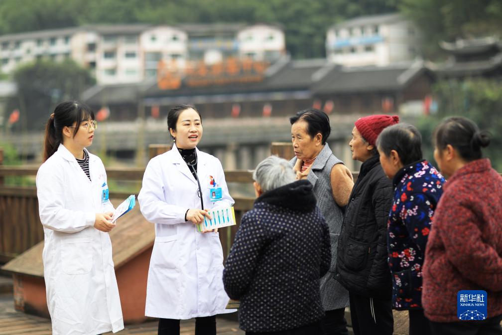 11月14日,貴州省赤水市丙安鎮衞生院的醫護人員在街頭為群眾講解糖尿病防治知識。