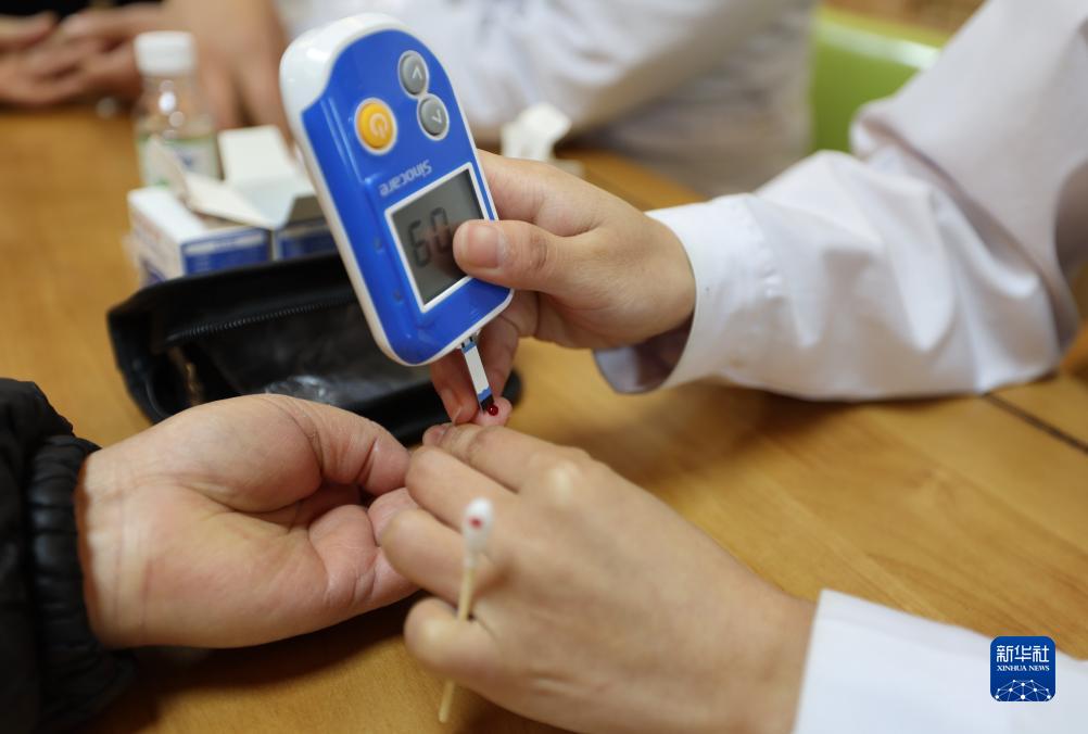 11月14日,在山東省臨沂市沂南縣界湖街道後中疃社區,醫護人員為居民免費測量血糖。