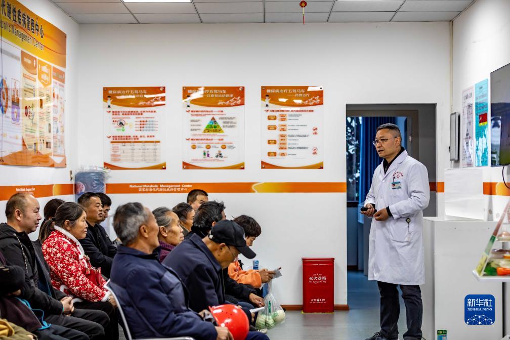 11月14日,醫生在貴州省黔西市人民醫院東橋路院區國家標準化代謝性疾病管理中心為前來就診群眾宣傳糖尿病知識。