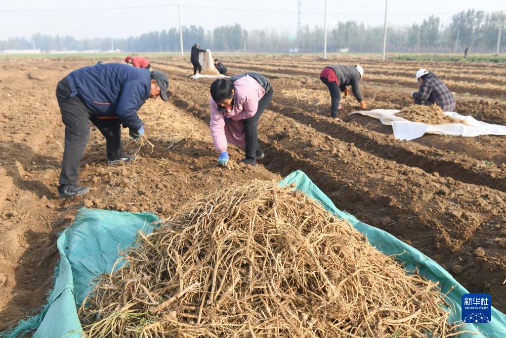 11月13日,在河北省新樂市馬頭鋪南雙晶村,種植專業合作社的農民收穫中藥材。