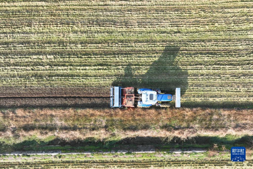 11月14日,在江蘇省淮安市洪澤區三河鎮,農民駕駛農機播種小麥(無人機照片)。