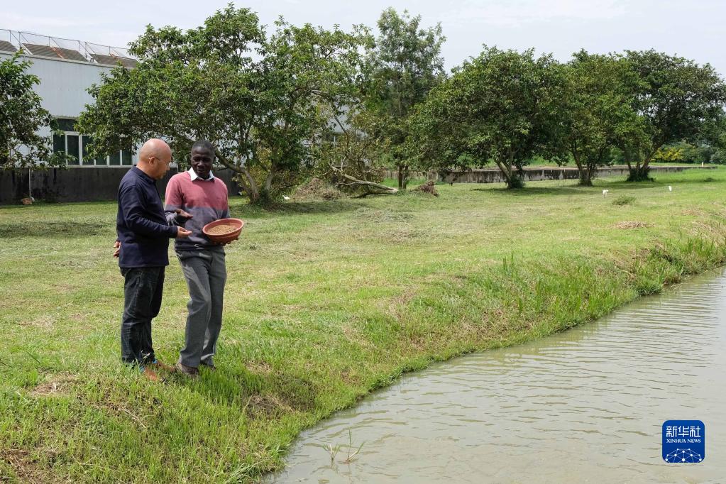 在烏干達首都坎帕拉市郊的烏干達水産研究與發展中心,一名當地員工在池塘邊與來自中國的水産專家陳太華交流(2022年12月21日攝)。烏干達水産研究與發展中心是中國-聯合國糧農組織-烏干達(三期)南南合作項目水産示範基地,這裡的漁場排灌系統採用中國技術建設而成。