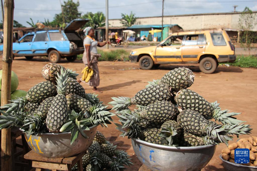 這是在貝寧“甜麵包”菠蘿主産區澤鎮一家水果攤拍攝的菠蘿(2023年10月23日攝)。“甜麵包”菠蘿是貝寧首個獲得非洲知識産權組織認證的地理標誌産品。近日,在第六屆中國國際進口博覽會上,空運來華的1000公斤貝寧“甜麵包”菠蘿首次與中國公眾見面。