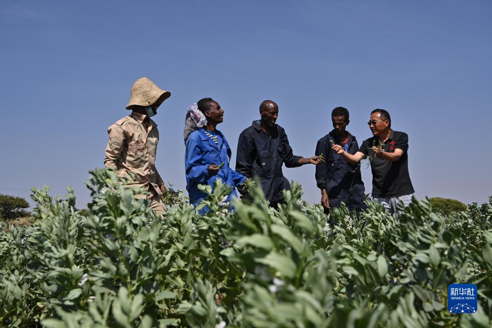 在位於厄立特裏亞阿斯馬拉的農業技術援助項目示範地,中國援厄第三期高級農業專家組豆類作物專家劉運民(右一)與當地農戶交流(2023年9月27日攝)。為推動厄立特裏亞農業産業發展,中國農業農村部已派出三批專家在厄立特裏亞開展涉及豆類作物、果樹園藝、油料等領域的技術援助工作,成效顯著。