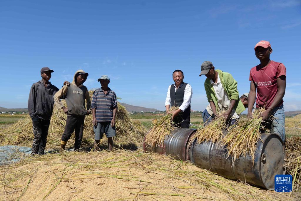 在馬達加斯加首都塔那那利佛附近的馬義奇鎮,中國雜交水稻技術專家胡月舫(右三)在中國國家雜交水稻工程技術研究中心非洲分中心的試驗田裏和當地農民一起收穫水稻(2023年5月12日攝)。自2007年開始,馬達加斯加與中國展開雜交水稻技術合作。馬達加斯加距離實現糧食自給自足的目標邁近了一大步。