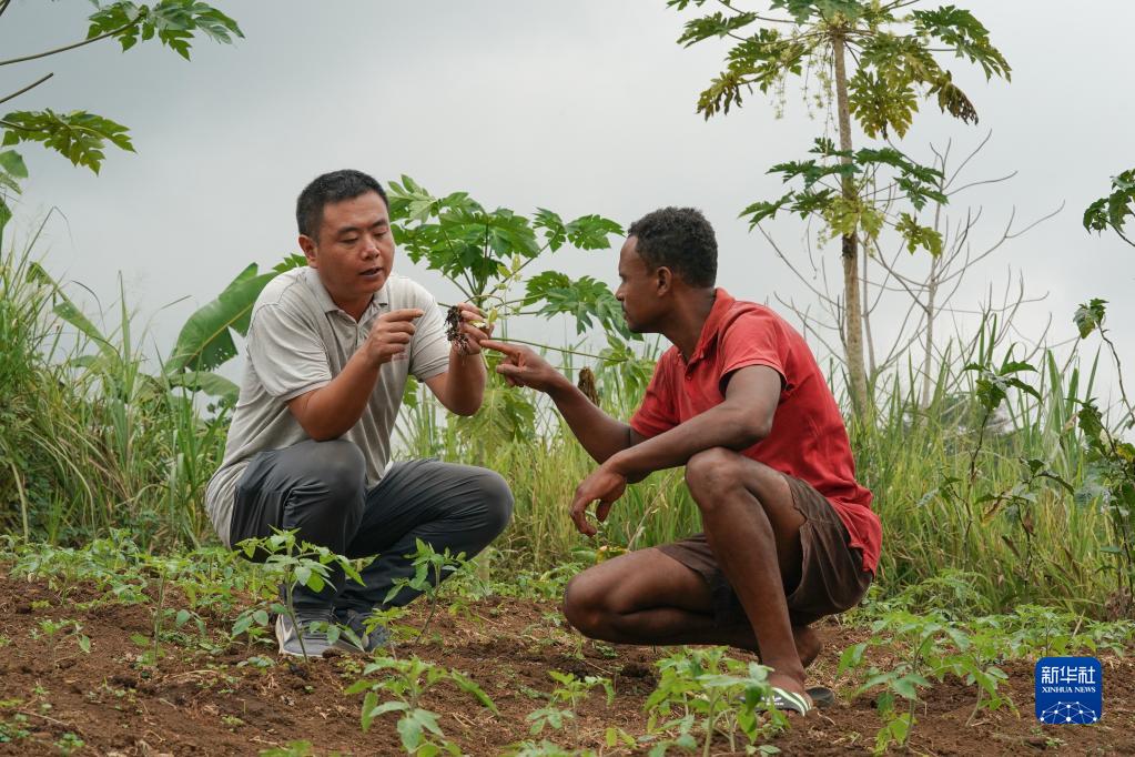 在聖多美和普林西比洛巴塔縣卡德拉斯村,中國援聖普農牧業技術專家組專家許州達在田間指導農戶努內斯種植辣椒(2023年7月15日攝)。中國援聖普農牧業技術專家組與聖普農業、漁業和農村發展部合作,於2021年在聖普洛巴塔縣卡德拉斯村建立第一個中聖普農業減貧示範村,並有效結合中國農業技術和扶貧經驗幫助當地農民增産增收。