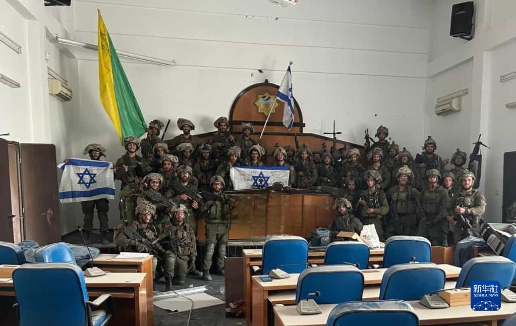 這張以色列媒體11月13日刊發的照片顯示,以色列國防軍士兵在加沙城巴勒斯坦伊斯蘭抵抗運動(哈馬斯)立法委員會大樓裏舉着以色列國旗。