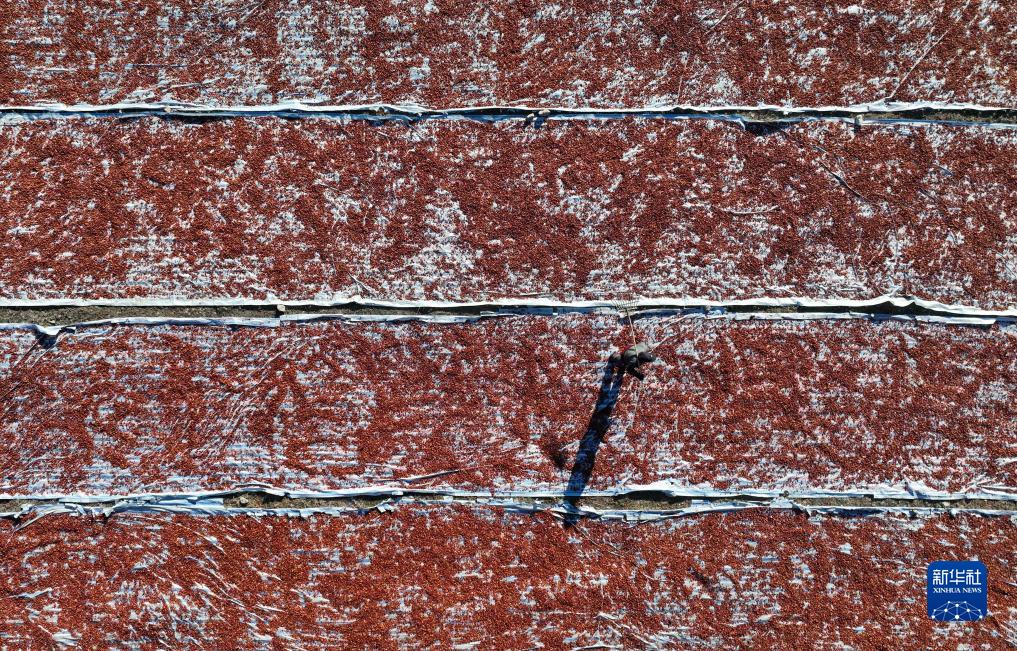 11月14日,河北省遵化市侯家寨鎮的農民在晾曬用於中藥材的山楂片(無人機照片)。