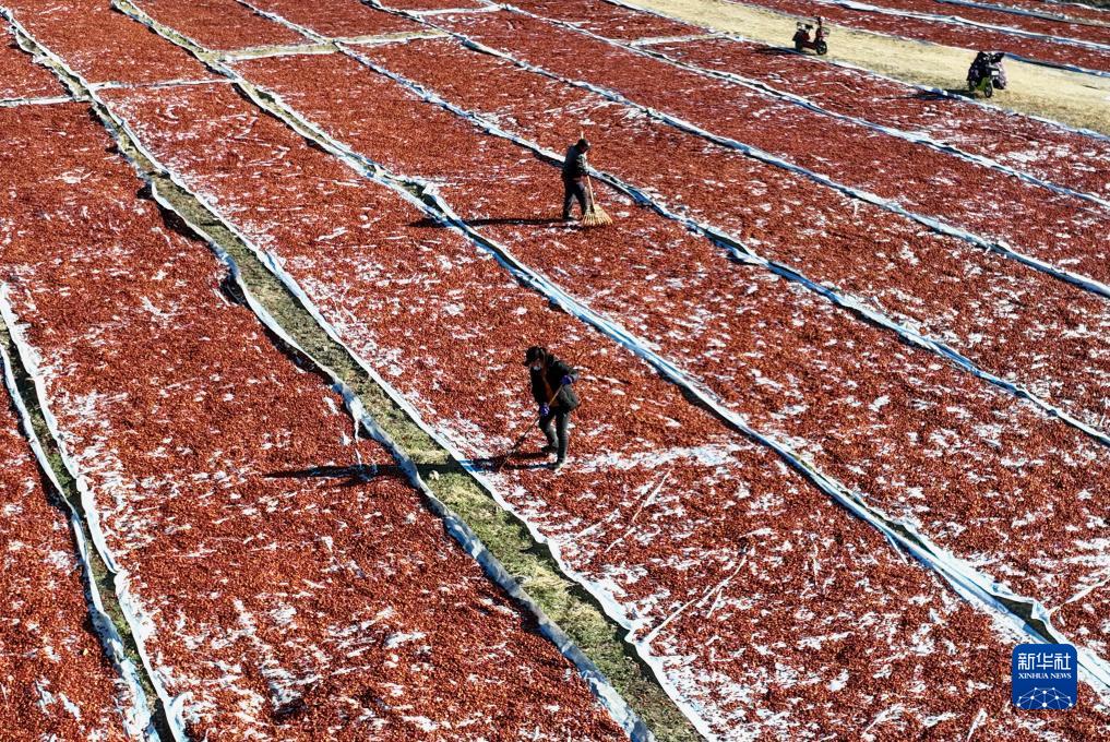 11月14日,河北省遵化市侯家寨鎮的農民在晾曬用於中藥材的山楂片(無人機照片)。