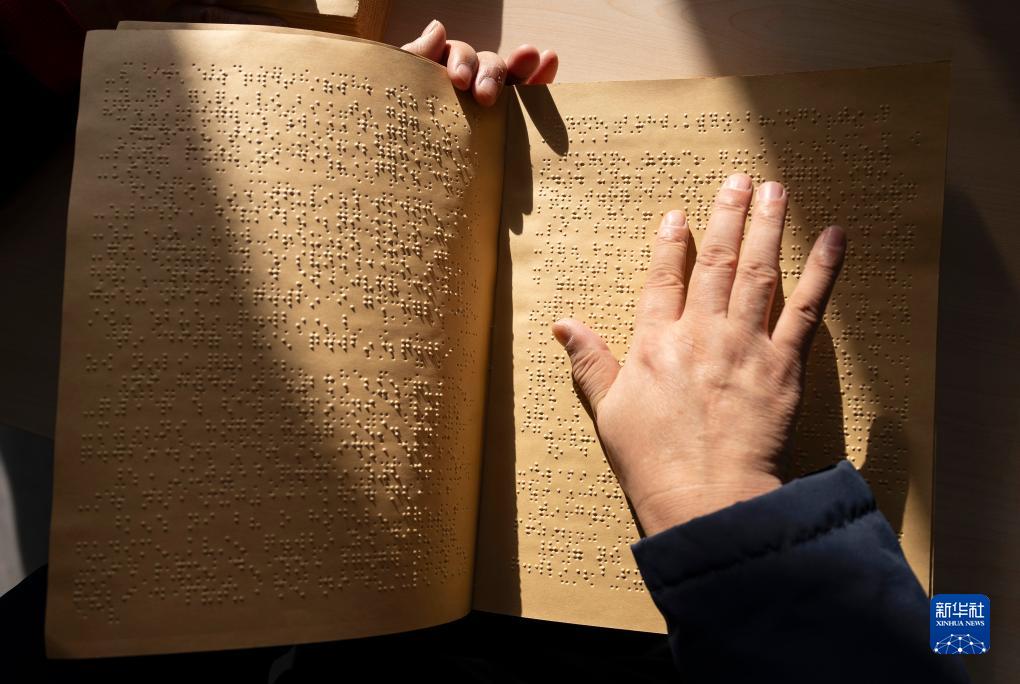 11月14日,在內蒙古烏拉特前旗圖書館視障閱覽室內,一名視障人士用指尖“閱讀”盲文書籍。