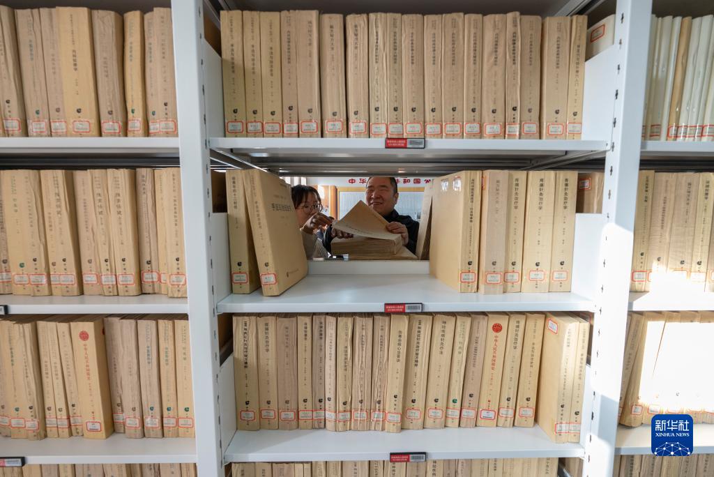 11月14日,在內蒙古烏拉特前旗圖書館視障閱覽室內,一名工作人員(左)幫助視障人士挑選盲文書籍。