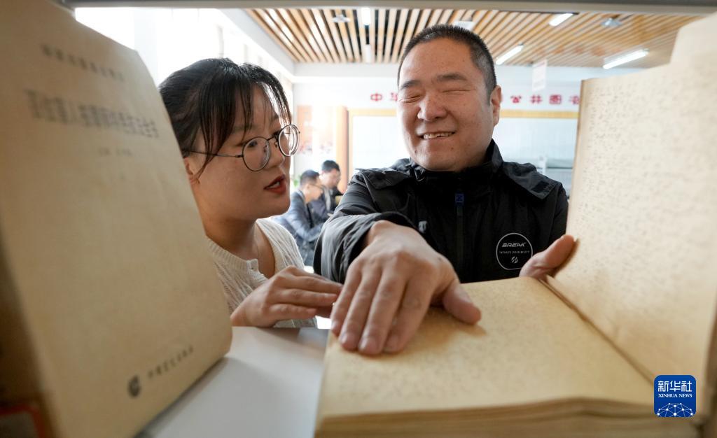 11月14日,在內蒙古烏拉特前旗圖書館視障閱覽室內,工作人員(左一)幫助視障人士挑選書籍。