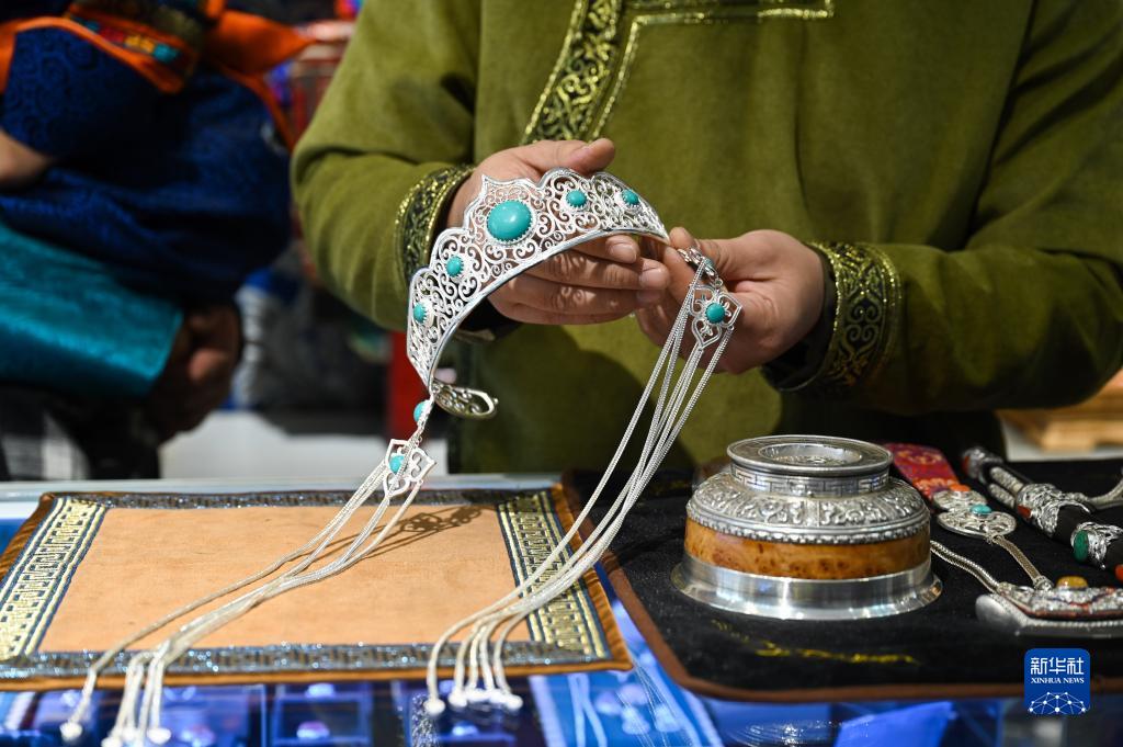 11月14日,在內蒙古烏拉特前旗禾蘇格爾銀匠店內,齊天賜展示自己製作的手工銀飾。