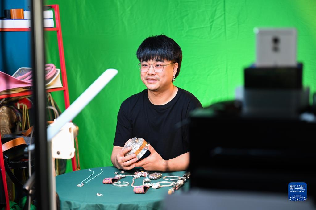 11月14日,在內蒙古烏拉特前旗的直播工作室內,齊天賜在網絡直播賣銀飾。