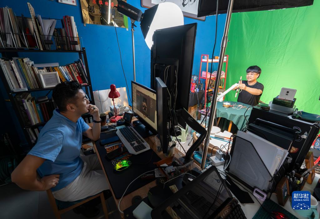 11月14日,在內蒙古烏拉特前旗的直播工作室內,齊天賜(右)在直播賣銀飾。