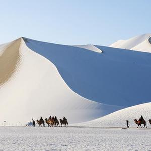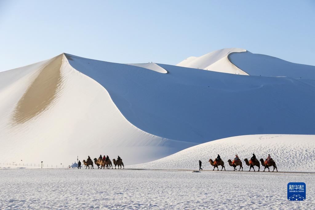 11月14日晚,甘肅省敦煌市迎來入冬以來的首場降雪。雪後的鳴沙山月牙泉景區銀裝素裹,景色如畫,美不勝收。