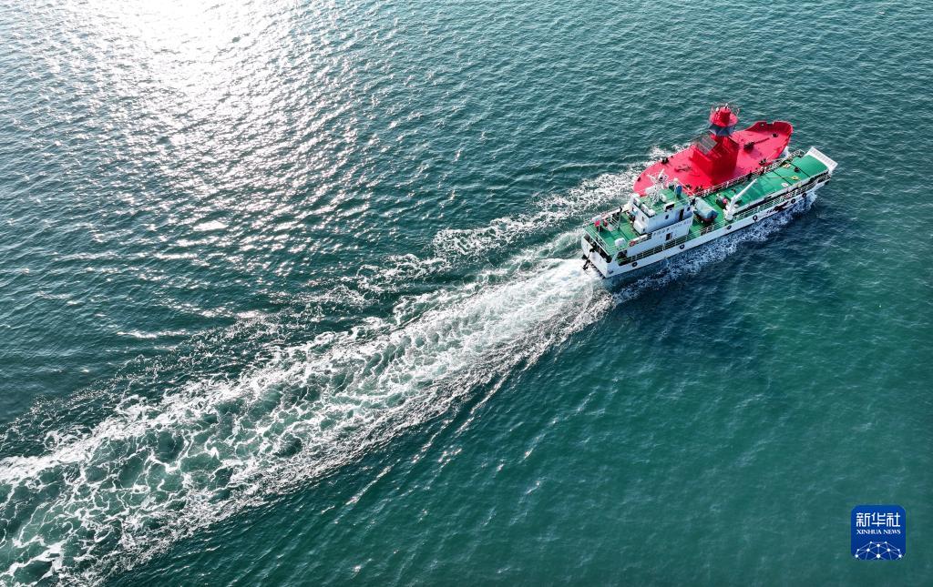 11月15日,青島航標處一艘工作船將新的航標燈船送往作業海域(無人機照片)。