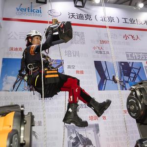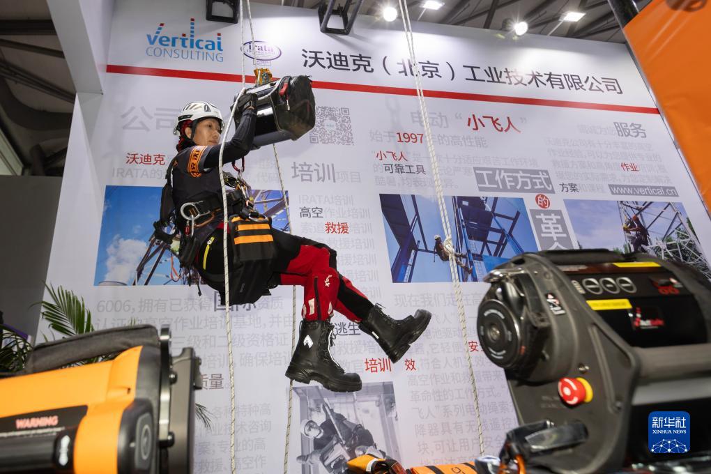 11月15日,在上海國際電力設備及技術展覽會的沃迪克展位,工作人員現場演示電動升降機。