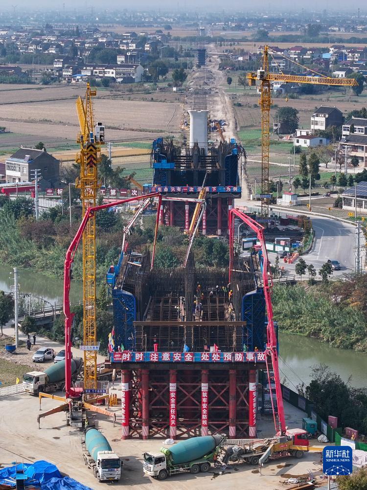 這是11月15日拍攝的滬渝蓉高鐵泰州段通泰揚特大橋跨如泰運河及X355縣道連續梁拱施工現場(無人機照片)。