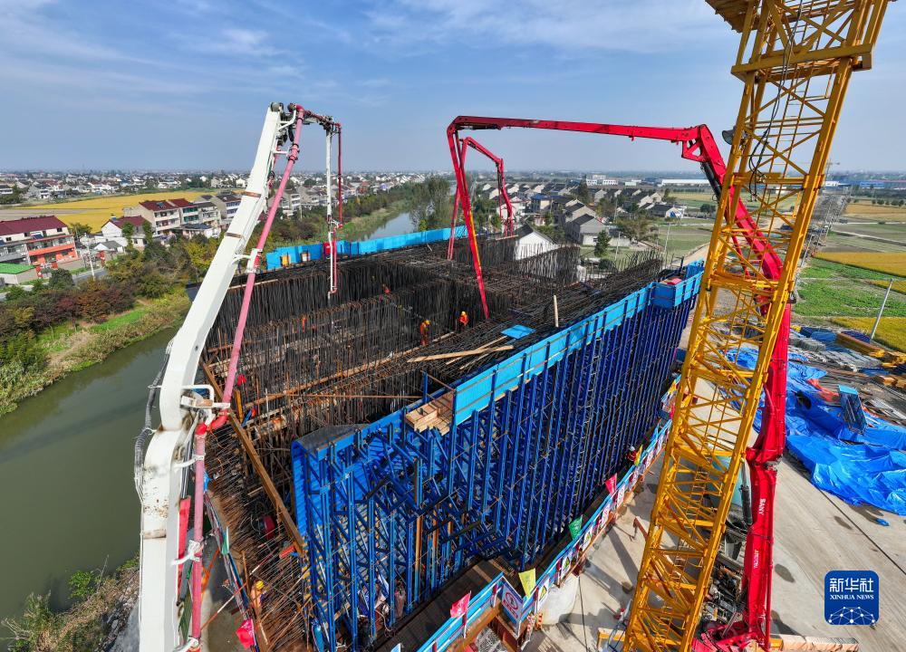 這是11月15日拍攝的滬渝蓉高鐵泰州段通泰揚特大橋跨如泰運河及X355縣道連續梁拱施工現場(無人機照片)。