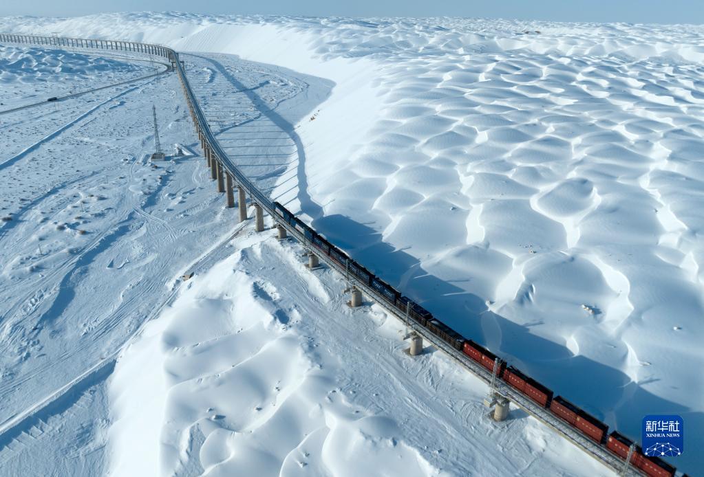 11月15日,在阿克塞縣,一列火車在大漠中穿行(無人機照片)。