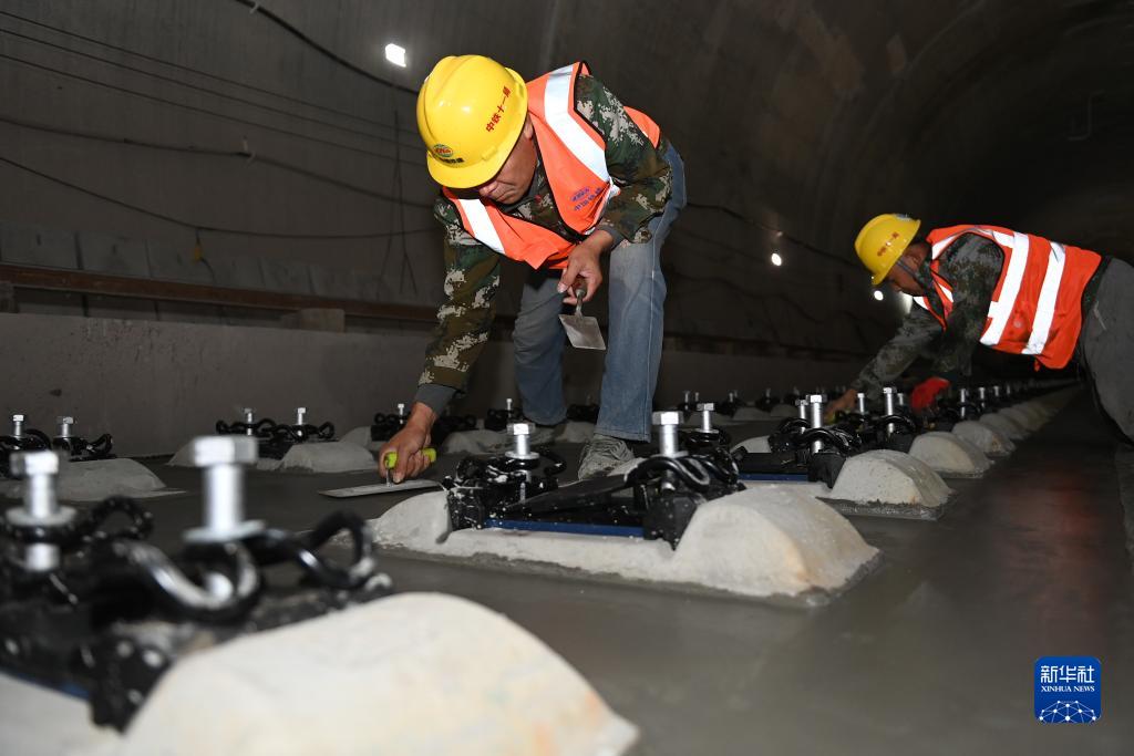 11月16日,中鐵十一局的建設者在杭衢鐵路(建衢段)天池山隧道無砟軌道澆築施工現場作業。