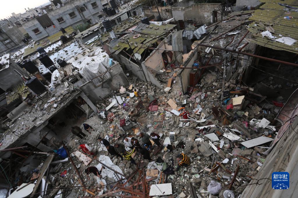 11月15日,在加沙地帶南部城市拉法,人們查看遭以色列空襲後的建築廢墟。
