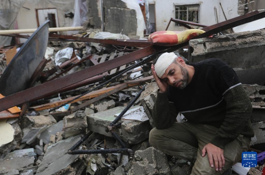 11月15日,在加沙地帶南部城市拉法,一名男子坐在遭以色列空襲後的建築廢墟中。