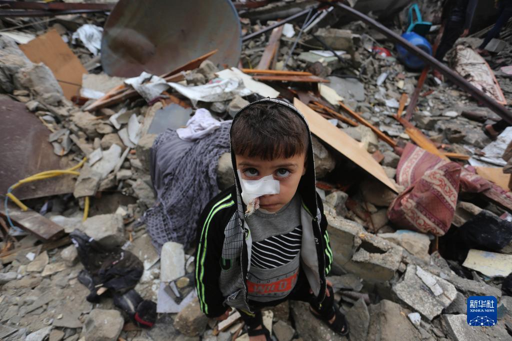 11月15日,在加沙地帶南部城市拉法,一名兒童站在遭以色列空襲後的建築廢墟中。