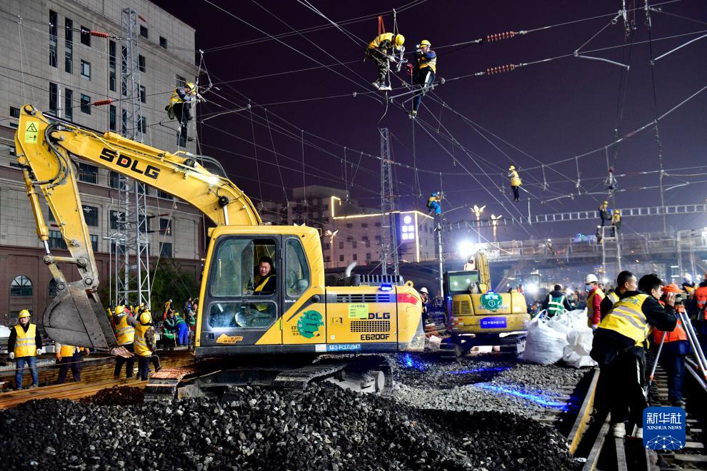 11月15日夜間,在濟南火車站,中鐵十局的工作人員正在對濟鄭高鐵引入濟南站進行站改作業。