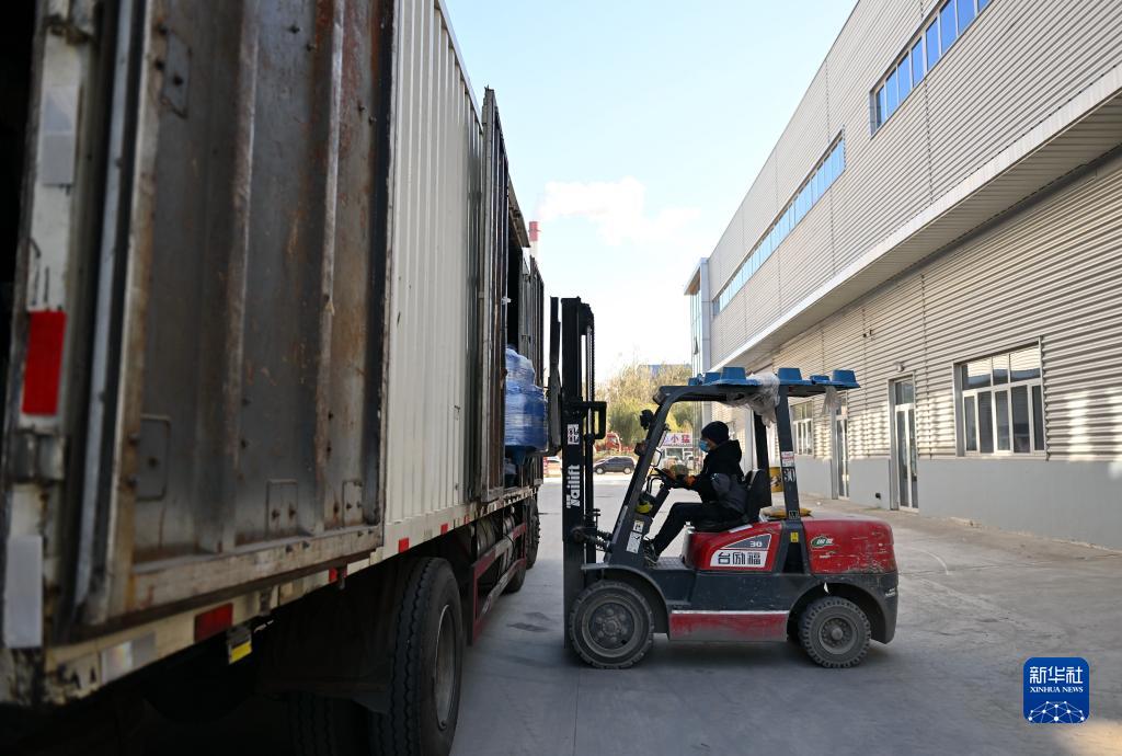 11月16日,在位於唐山市豐潤區的唐山公路港物流有限公司,工人駕駛叉車運輸貨物。