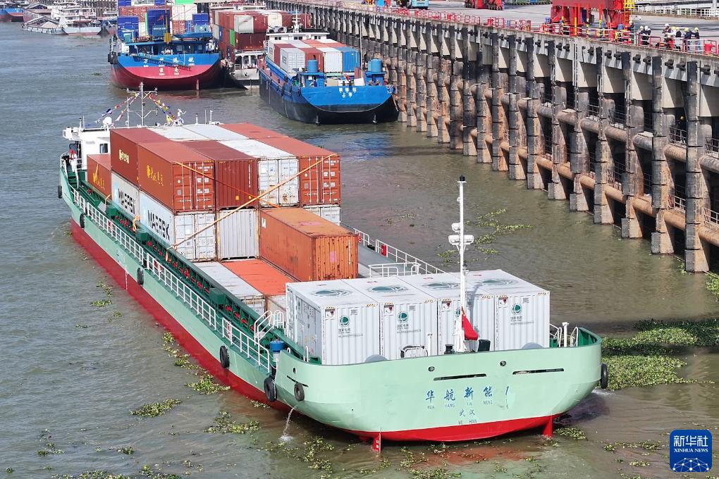 當日,漢江首艘純電動集裝箱示範船“華航新能1”在湖北武漢首航,由此開啟漢江航運的電化時代。