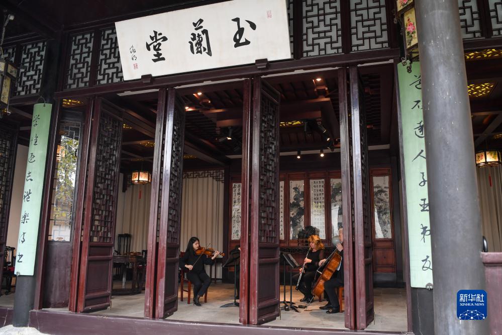 11月16日,費城交響樂團的演奏家們在蘇州拙政園玉蘭堂內演奏。
