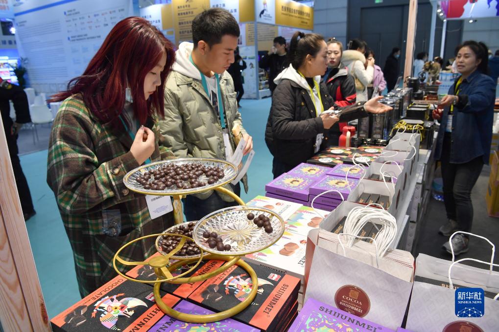 11月16日,觀眾在第七屆絲博會印度尼西亞展位上參觀選購食品。