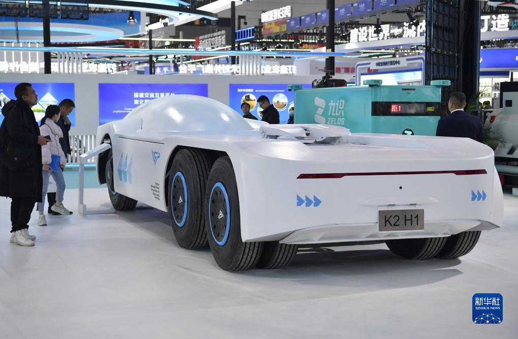 11月16日,觀眾在第七屆絲博會上參觀一款電動重卡滑板底盤。