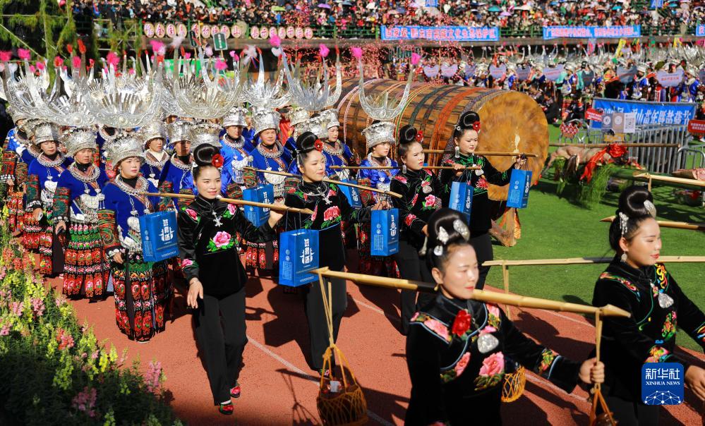 當日,貴州省黔東南苗族侗族自治州雷山縣迎來苗族同胞的傳統節日苗年。今年苗年又恰逢十三年一次的鼓藏節,歡樂氣氛格外濃烈。來自縣內外的數萬名苗族群眾歡聚雷山縣城,通過盛裝巡游、非遺展示、千人長桌宴等形式歡度節日。苗年和鼓藏節均為國家級非物質文化遺産。