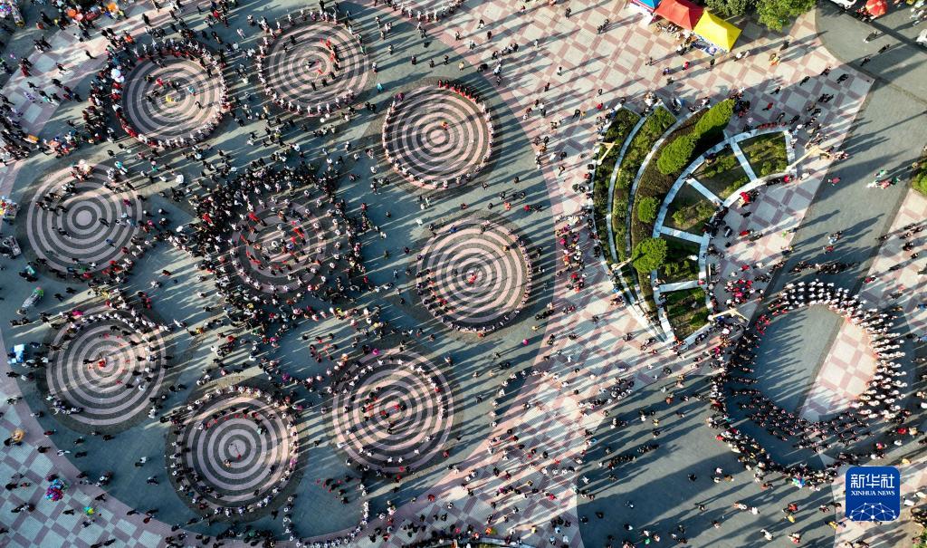 11月16日,在雷山縣民族文化活動中心,苗族同胞身着盛裝,載歌載舞歡慶苗年和鼓藏節(無人機照片)。