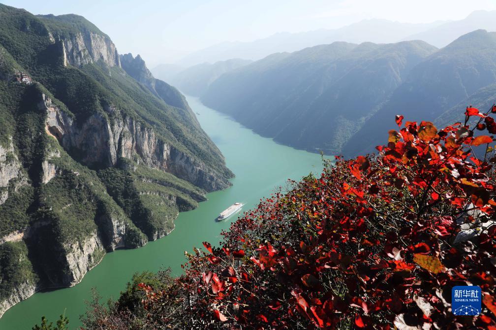 11月16日,在重慶市巫山縣,輪船航行在紅葉映襯下的長江三峽巫峽水域。