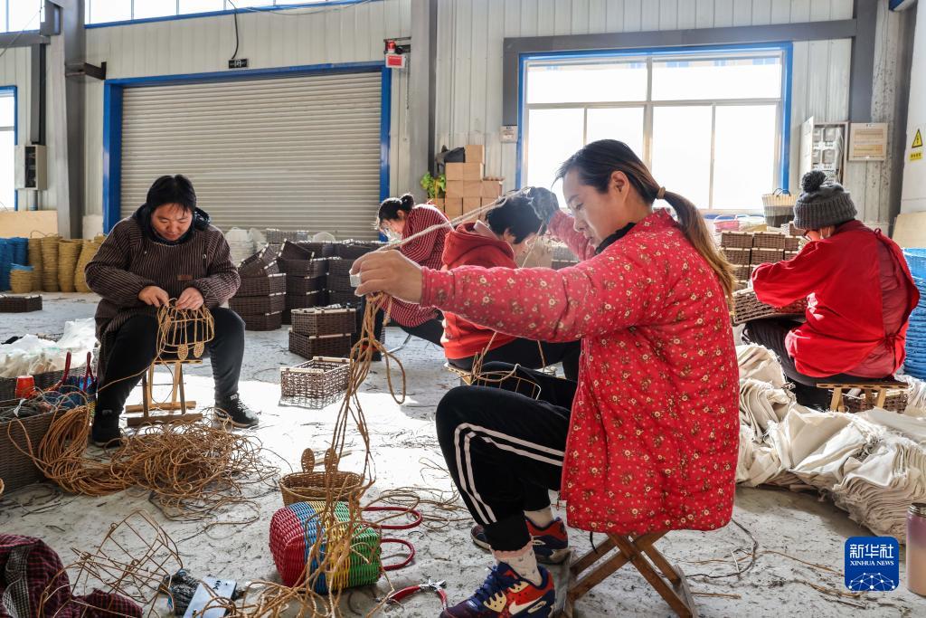 11月16日,東平縣老湖鎮水滸安置社區居民在手作加工點加工藤編産品。