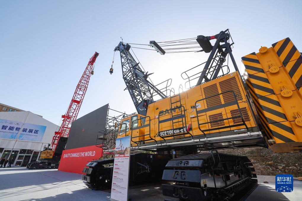 11月17日,這是數智物流裝備産業展上展示的吳興高新區三一集團首發的100噸級純電驅動履帶起重機。