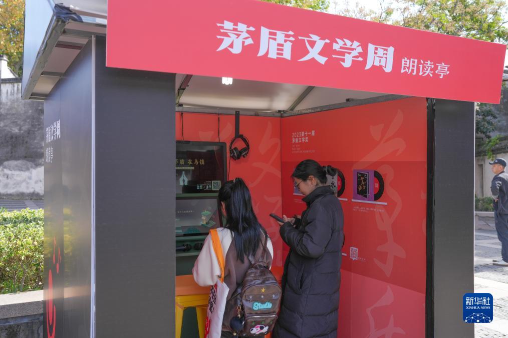11月17日,人們在烏鎮景區茅盾文學周朗讀亭內體驗。