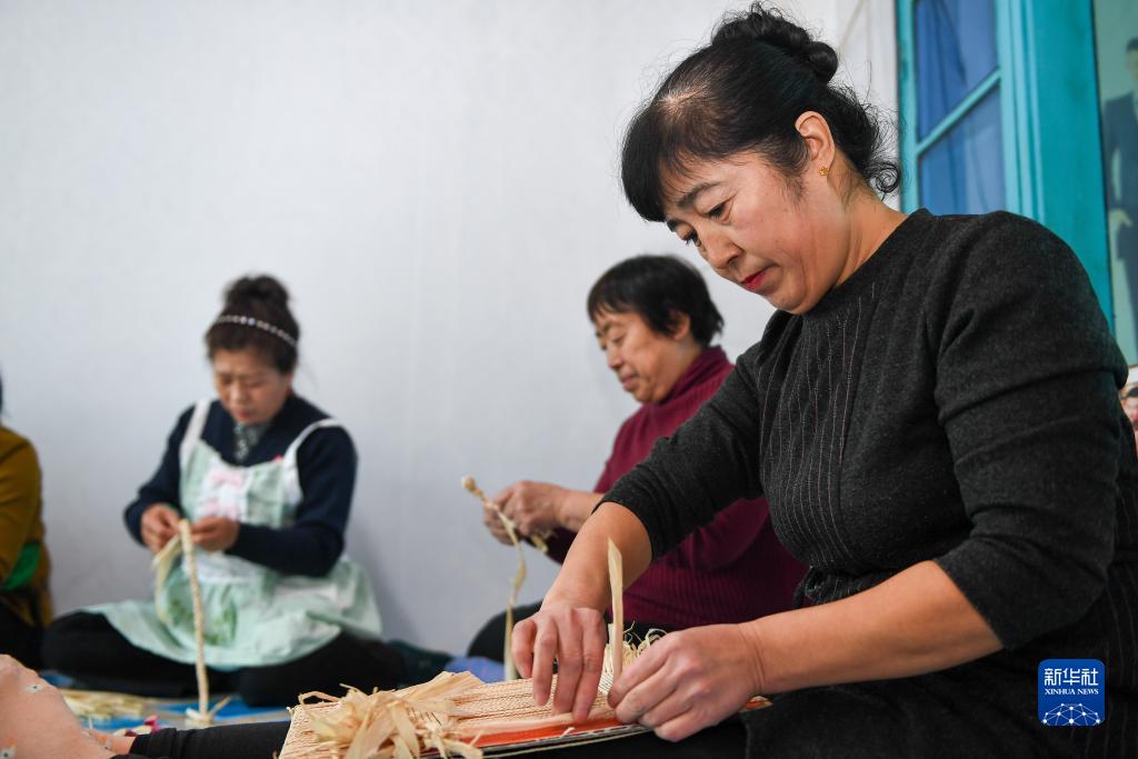 11月16日,在長春市九台區龍嘉巧姐草編農民專業合作社,閆金鳳(右)帶領社員製作草編工藝品。