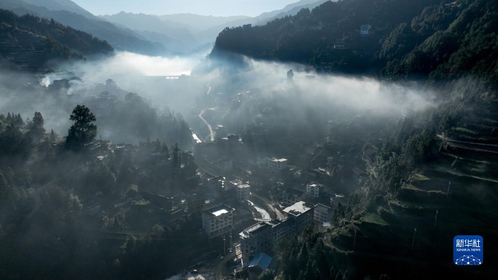 初冬時節,位於貴州省黔東南苗族侗族自治州雷山縣境內的雷公山國家森林公園,雲霧繚繞,民居、梯田、公路、橋梁交相輝映,美不勝收,景色如畫。