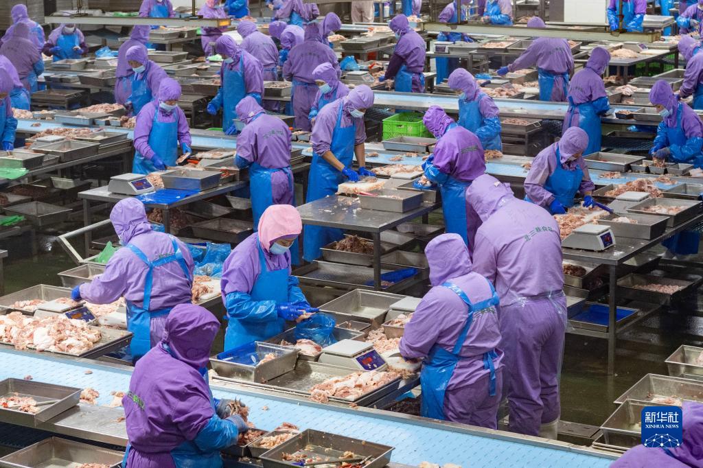 11月15日,在位於鶴崗市蘿北縣的黑龍江北三峽食品有限公司,工人在生産車間內加工雞肉。