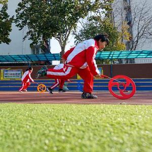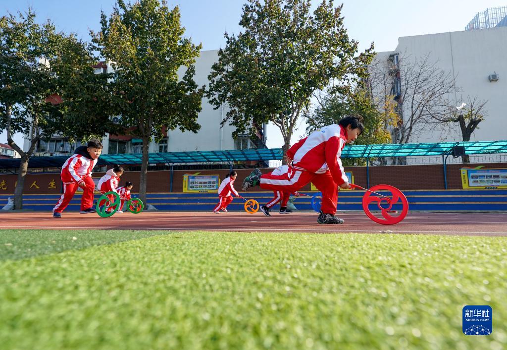 11月17日,河北省唐山市路北區光明實驗小學的學生利用課間時間玩滾鐵環。
