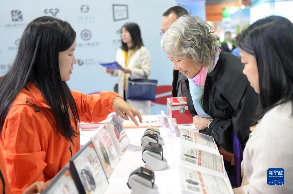 11月17日,一名老年人在展會上參觀選購一款監護手錶。